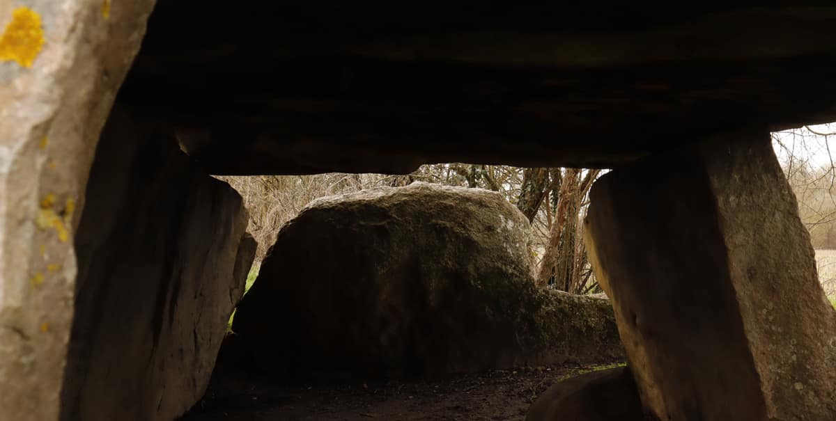 Il est composé de 5 pierres levées de 1m50 de hauteur, et de la table fendue qui avait à l’oirigine 8 mètres x 3 mètres et 0m60 d’épaisseur…