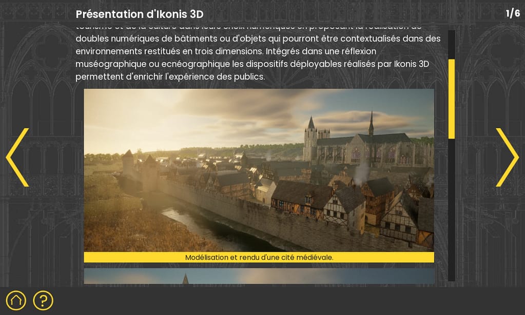 Ikonis Visio est une application basée sur des structures de données éditables. Textes, images ou modèles 3D sélectionnés peuvent être présentés aux visiteurs dans des dispositifs tactiles offrant des parcours thématiques variés qui viendront enrichir un parcours numérique en s’intégrant facilement dans des dispositifs Android ou Windows déployés dans les parcours de visite.